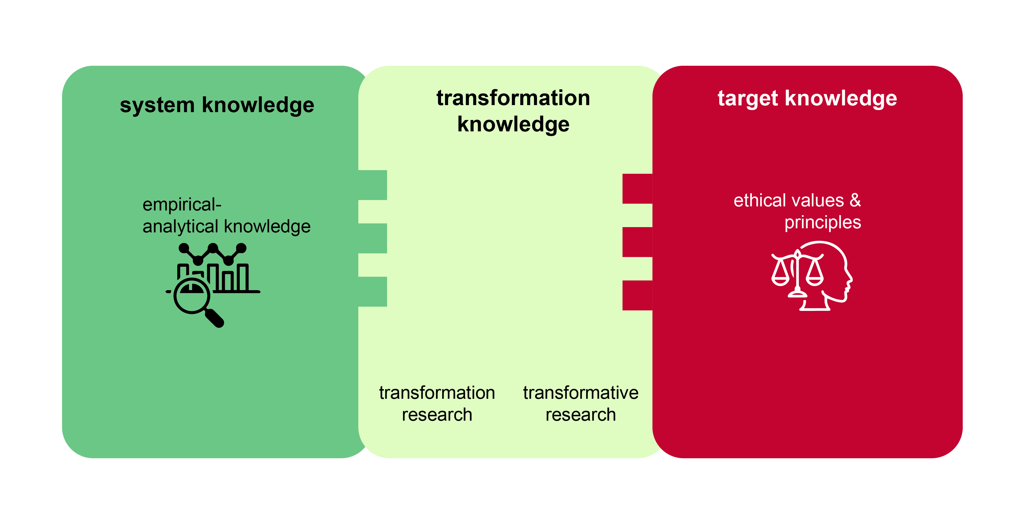 Target knowledge refers to what should be achieved and what should be avoided, and is particularly relevant through normative research. This encompasses the interpretation and concretization of the values associated with sustainable development, as well as the derivation of additional norms. Research that addresses the definition of thresholds, assessment methods, and visioning processes facilitates the formulation of clear recommendations regarding the necessary transformations (Figure 3.1).