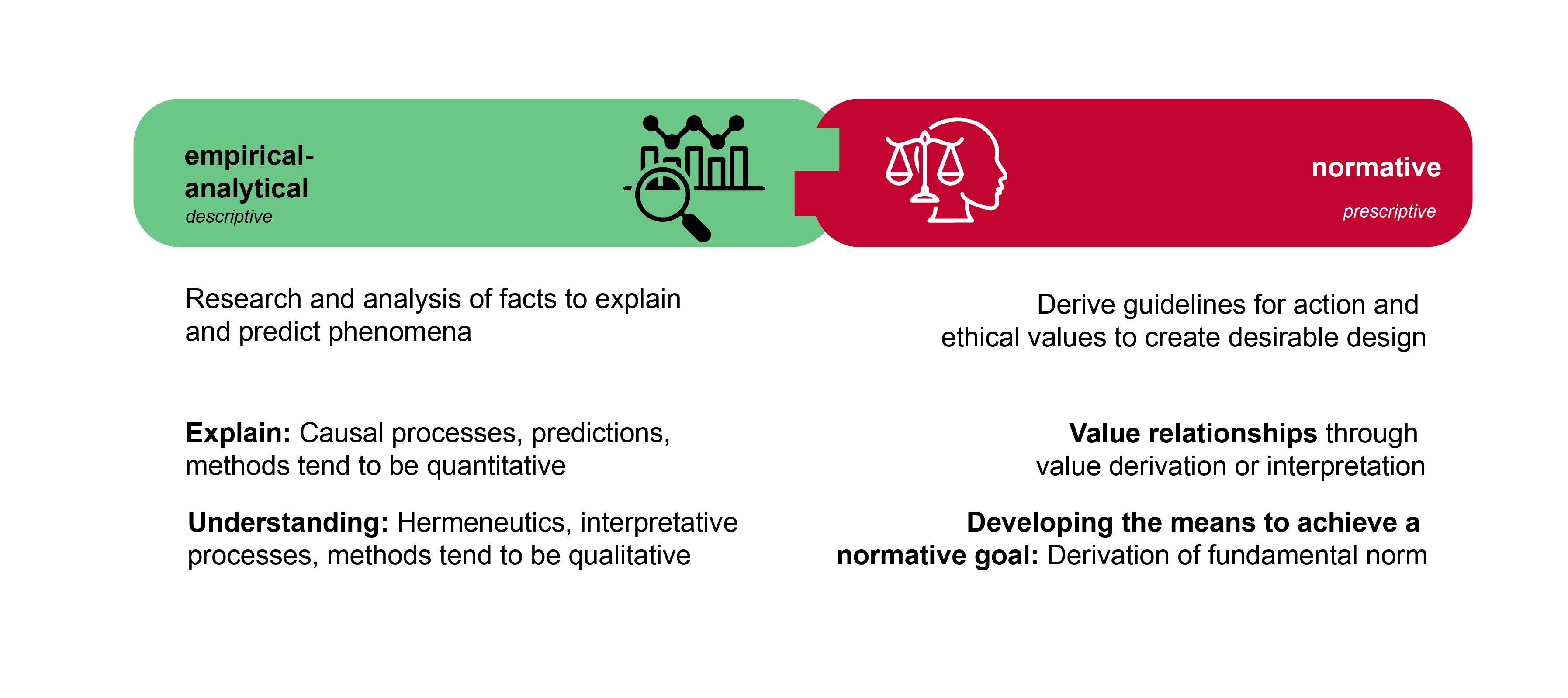 As sustainable development is a normative model, it is important to distinguish between descriptive (empirical-analytical) research and prescriptive (normative) research. Descriptive statements describe the current state (“is”, e.g., vegetables contain a relatively high proportion of vitamins), while normative statements describe the ideal state (“ought”, e.g., you should eat vegetables). In everyday life, the distinction between “is” and “ought” is often not recognized, but it is crucial for science. Moreover, it is essential to recognize that individuals hold diverse perspectives, which can lead to diverging opinions regarding what is optimal or what sustainability should entail. Consequently, the concepts of “sustainability” or “sustainable development” cannot be regarded as impartial or neutral.