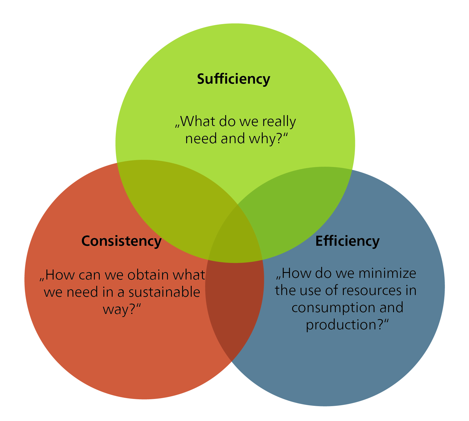 “Sufficiency” questions the extent of what is needed for a good life and aims to reduce resource and energy consumption by lowering demand for resource-intensive goods and services. Sufficiency is often translated as contentment, frugality or moderation. It takes a critical look at the new needs created by technology and advertising in relation to limited natural resources. Sufficiency promotes an understanding of not chasing every newly created need and to satisfy needs without commercial consumption. Unlike efficiency and consistency, sufficiency focuses on consumption, but not exclusively: sufficiency can be practiced to varying degrees and at different levels, from minor behavioural changes (sharing instead of buying) to significant lifestyle changes (giving up air travel). Although it starts at the individual level, sufficiency can be applied at various levels, including businesses (sufficiency-oriented product design) and governments (sufficiency policy). Sufficiency therefore asks about the right amount: How much do we need for a good life? And what do we not need? The sufficiency strategy is the subject of passionate and intense debate (Sedláček (2012)).