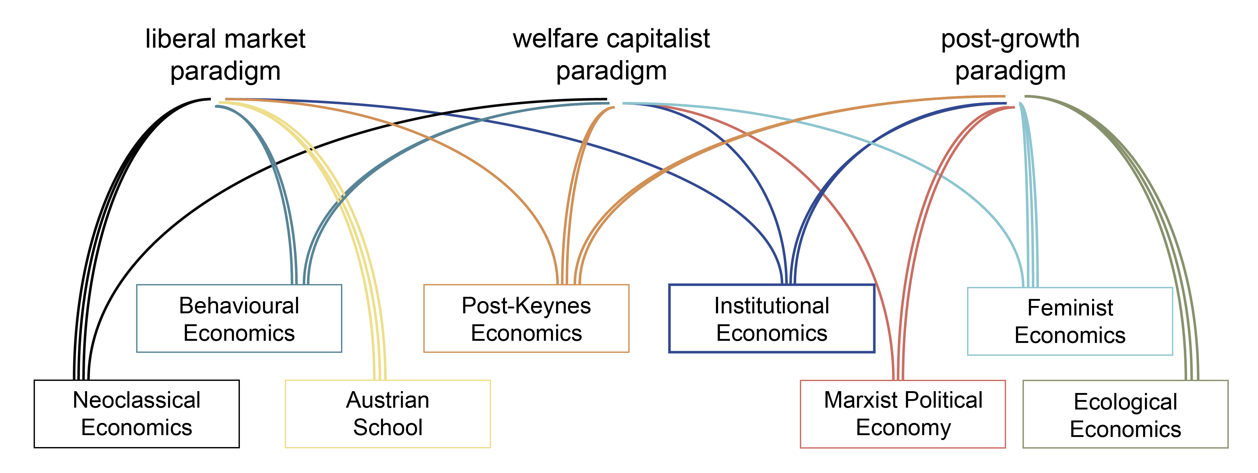 In the next section, we will explore various approaches to sustainable economics. We will draw on these guiding paradigm, focusing in particular on the post-growth paradigm and, to a lesser extent, on green growth approaches within the welfare capitalist paradigm. In line with the different influences of these schools of thought on the frameworks, we will also have to consider the various economic theories and approaches of pluralist economics. These theories offer different perspectives on the challenges and goals of sustainable economics and shape the three paradigms. Below is an overview of how these schools of thought influence the three paradigms– market liberalism, welfare capitalism, and post-growth. This overview should enable us to better understand the many facets of the sustainability debate and develop approaches that can meet the requirements of a more sustainable future. However, these classifications are not set in stone and may vary depending on the specific point of view and context. Some schools of thought may also fall completely outside the three guiding paradigms. In pluralist economics, there are a variety of approaches and theories that can shed light on different aspects of economic and societal design. Combining and integrating these different perspectives can lead to a more comprehensive understanding and approach to promoting sustainability.