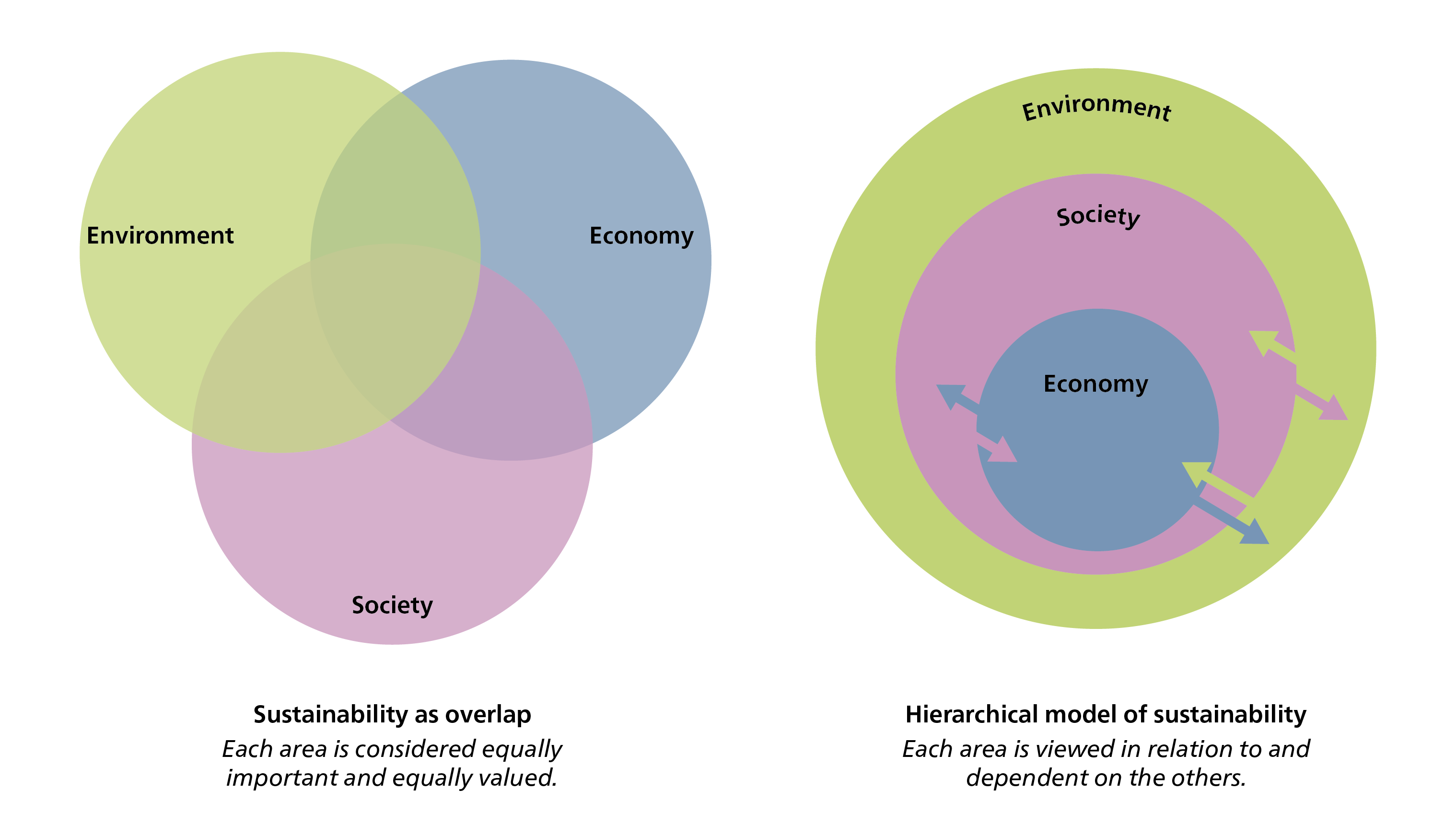 The two polar positions, green growth and post-growth, refer to different definitions of sustainability. The concept of sustainability can be classified on a continuum from weak to strong. In this context, the extreme positions lead to one-dimensional interpretations that fail to recognize the multidimensional character of the sustainability model.